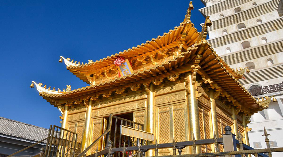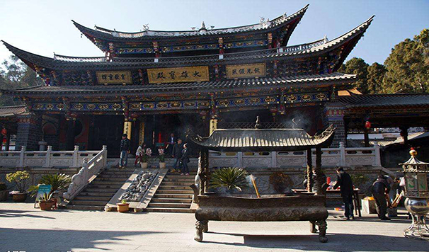 为鸡足山最大古刹,初建于明嘉靖年间。清光绪年间,由著名禅宗大师虚云和尚募金修建而成。寺门左侧的高大照壁上绘有《鸡足山全景图》。门前有半圆形的放生池,池中有八角桥亭,名“镇宝亭”。大雄宝殿匾的左侧有孙中山所题的“饮光俨然”匾,右侧有梁启超所题的“灵岳重辉”匾。整个寺院规模宏大、建筑庄严,富有民族和宗教特色。
