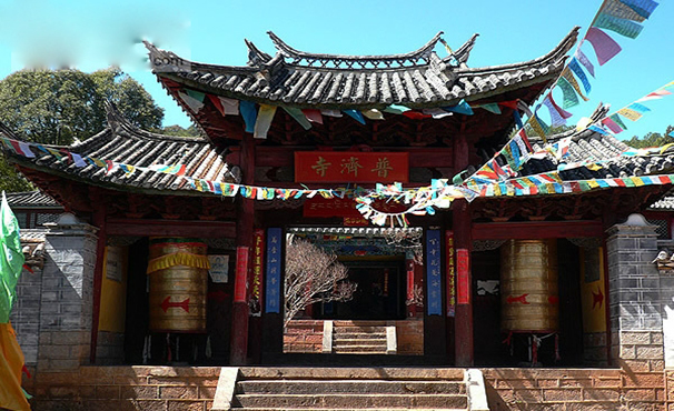 普济寺位于丽江古城西北6千米的普济山中,始建于清乾隆三十六年(1771年),为丽江城郊五大喇嘛寺之一,因大殿铺盖铜瓦面而闻名遐迩。大殿院落由山门、护法堂(门楼)、正殿、南北厢房组成四合院。正殿平面是长方形,初用土瓦覆盖,由圣露活佛辗转西南各地讲经、集资,于1936年改覆铜瓦,面积为46.4平方米。1988年列为省级文物保护单位。大殿院内,有两棵云南樱花,植于1771年,为云南樱花之最。