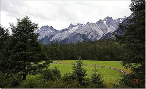 登高俯视,玉龙雪山俨然一擎天之玉柱,撑起头上一片蓝天,转身了望,一马平川、广阔坦荡的田园风光尽收眼底。