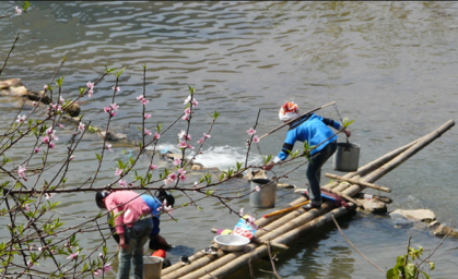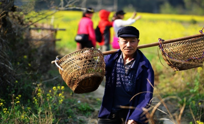 进到寨里,随处可见扎着帕角、穿着黑兰色裙、脚蹬绣花鞋的女人在自制的人工石磨前推磨,在古老的木制纺织机前纺线、织布,在用众山采来的草叶靛染后做成的土布上绣花,男人们则背回大架大架的柴禾,小孩和老人担着竹水桶去泉眼里挑水来蓄在自制的石缸里供家人饮用。