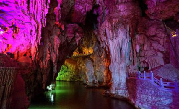 路全长750米,从洞口乘龙舟顺流面下,可饱览沿河的奇观美景,置身于燕子洞宏大壮观的洞腔之中,并直驱第三景区"梦幻世界"大厅。该厅面积为13000平方米,大厅右侧置有彩色灯光喷泉和瀑布。