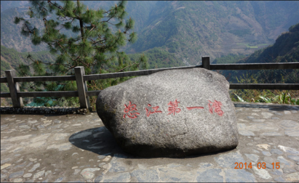 怒江流经云南贡山县丙中洛乡日丹村附近,由于王箐大悬岩绝壁的阻隔,江水的流向从由北向南改为由东向西,流出300余米后,又被丹拉大山挡住去路,只好再次调头由西向东急转,在这里形成了一个半圆形大湾,为怒江第一湾。湾中心有一个村子叫坎桶村,这里江面海拔1710余米,气势磅礴,湾上怒江台地平坦开阔,高出怒江500米,构成三面环水的半岛状小平原。小平原四周景物宜人,每到农闲季节或节假日,人们便到这里泛舟过溜,对歌起舞,坎桶村堪称峡谷桃源。