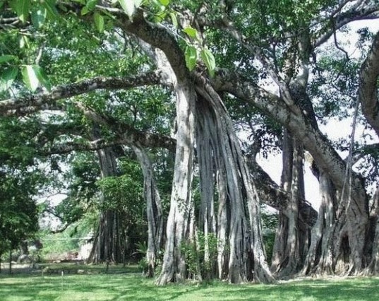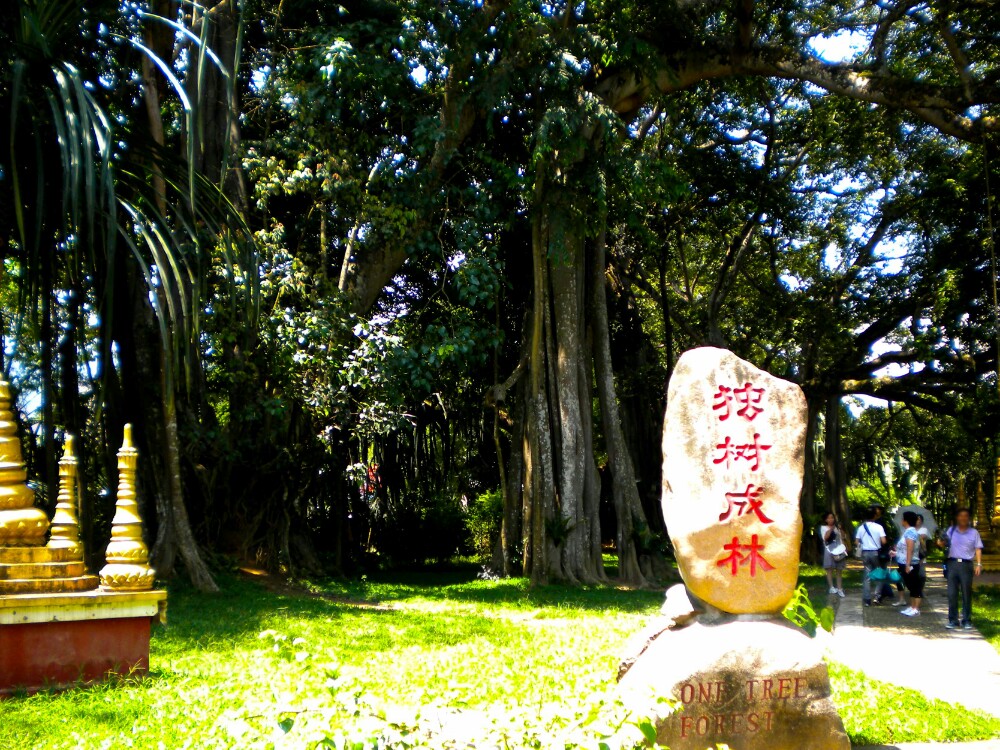 独树成林,它仅是一株大榕树,因母株树干向四周发展,又从枝干生出气根,气根入土又长成粗干,再向更远的地方发展,组成了这一片榕树林,成为令人叹为观止的独树成林奇景。据考证,这株大榕树树龄已超过百年,母树主干要七八个人才能合抱,枝繁叶茂,四季长青,气根发达,覆盖面宽达4亩多,成为德宏亚热带风光代表性的一景。