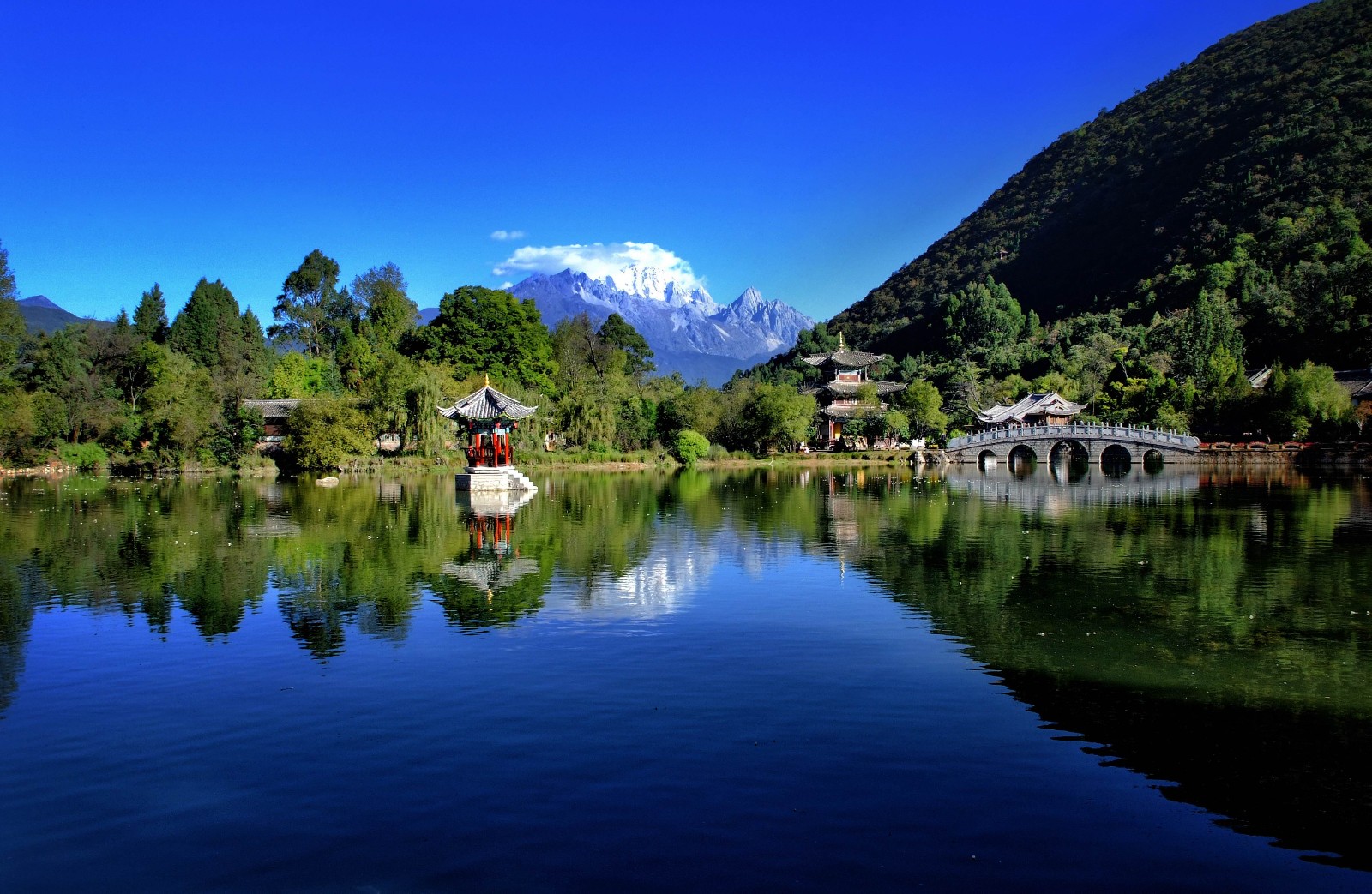 丽江黑龙潭始建于乾隆二年(1737),其后乾隆六十年、光绪十八年均有重修记载。旧名玉泉龙王庙,因获清嘉庆、光绪两朝皇帝敕封"龙神"而得名,后改称黑龙潭。诗云:"泉涣涣兮涟漪,问何时最是可人?须领略月到天心,风来水面;亭标标而矗立,看这般无穷深致,应记取云飞画栋,雨卷珠帘。"黑龙潭以其天生丽质,名列《中国名泉》、《中国风景名胜》等书,诚不虚也。迎面见有一座涂金绘彩的牌楼,门口四尊石狮,肌理秀美,威武雄壮,过去守护木氏土司衙门,1966年迁此守护玉泉。进门往右,但见垂柳飘指,一潭澄碧,树底天光云影,树梢楼台隐现。沿潭右堤至锁翠桥,桥上古人有联云:"惊涛撼树飞晴雪,未雨垂虹卧曲波。"它生动地描绘了桥边景致。右边桥下三孔飞瀑,水花四溅,涛声如雷,流向古城,玉水河畔,杨柳依依,浓荫蔽日。往桥的左边看,一座五孔石拱桥,长虹卧波一般,将潭一分为二,玲珑俊美的一文亭、得月楼分别屹立内外潭心,四面临水,有桥与岸上相连。此楼始建于清光绪二年(1876年),楼名取自古人对联"近水楼台先得月、向阳花木早逢春"中三字。1963年重建时,郭沫若为该楼题写了匾额"得月楼"三字及两副对联。一副是集毛泽东诗词句:
