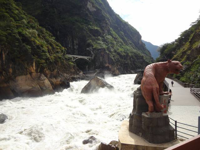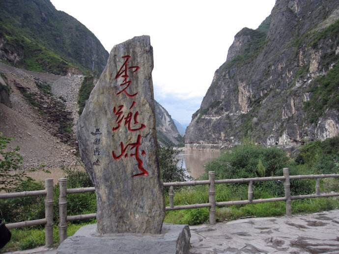 沿山路前行,尺把宽的小径忽升忽降,脚下是深不可测的悬崖,谷底是惊涛骇浪的轰鸣,头上是呼啸而过的劲烈江风,逼着人靠近岩根,小心前进,偶尔碰落一个石头,便如九飞坠,很久才见到它落进江心激起的浪花!走过有斜坎的陡壁,一道银流,闪入眼底,这便是”上虎跳“。只见两山夹峙,形若两扇铁门,当中立着青黑色的虎跳石,似凶神恶煞的把门将军。金沙江从他的两侧越过断崖,凌空飞下,以雷霆万钧之力冲向崖底,又弹跳而上,形成万朵雪白晶莹的浪花,旋即化作银雨乳雾,润湿了周围的岩石草木。断崖之下,千波万涛,沸沸扬扬,回旋翻滚,如千条蚊龙搅湖闹海,似万匹银马奔腾驰骋,然后乘风而去。面对这壮丽的图景,这磅磅的气势,令人浩气溢怀。清代雍乾之际的云南诗人孙鬃翁,在《金沙江》一诗中写道:劈开善城斧无痕,流出犁牛向丽奔。一线中分天作堑,两山夹斗石为门。虎跳峡的壮美风光吸引了大批国内外”背包客“来这里徒步旅行。