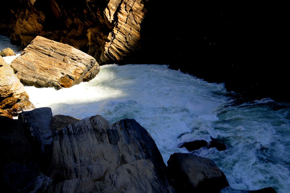 续前行,到”中虎跳“。这里喝崖排空,或直刺青天,或斜扑江口,宽阔浩荡的江水,遇到危崖的挤压与阻拦,似乎变得怒不可遏,它聚集力量,向崖石不断发起冲击,狂涛汹涌,飞瀑腾空,空谷轰鸣,声震山谷。江底惊涛裂岸,崖头山泉喷泻。当你在哈巴雪山腰,沿着壁间蹬道小心攀行时,常常会遇到飞泉流瀑,从你顶上掠过,犹如进入水帘洞中。