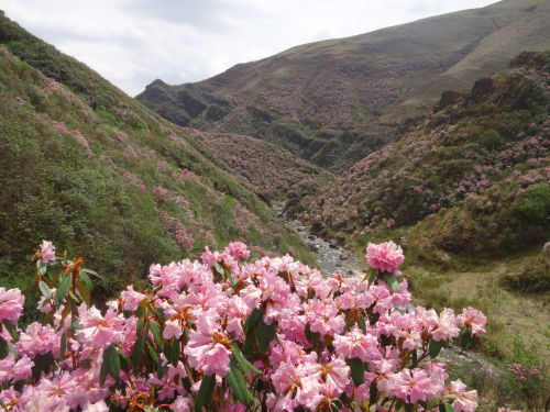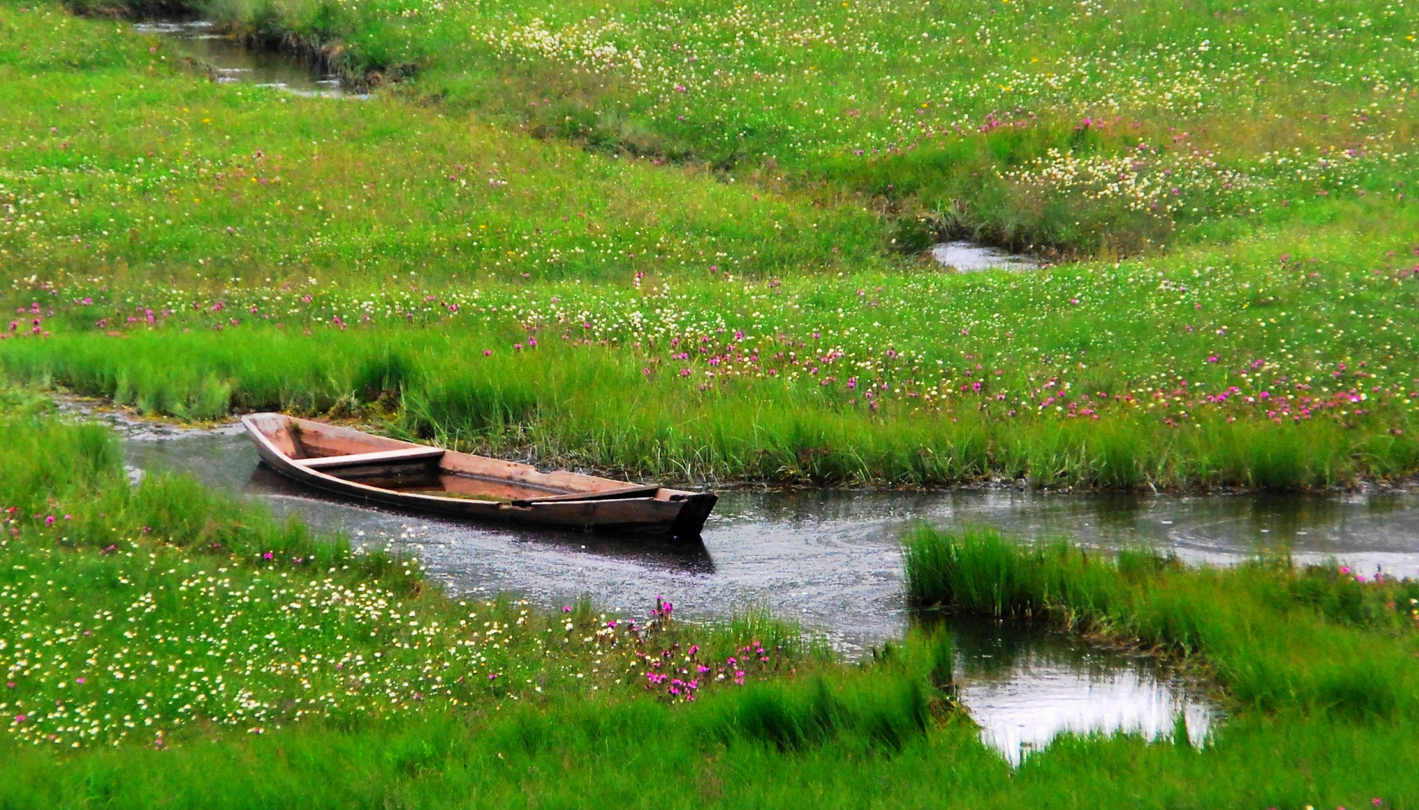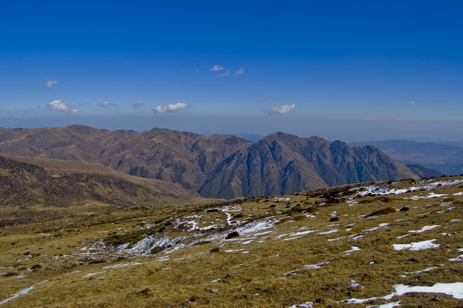 大海草山,因草而得名,因草而成名。偌大的20万亩,是山顶起来的草海或是草堆积而成的山峦。在南方,草山的春来得是要慢些。仲春时节,满山的草才开始抽芽,远远看去,淡淡的草绿取代了堵心的枯黄;然而,当走近后,草绿却隐身于枯黄之中了。此时,很容易便读懂了"草色远看近却无"。无需几个时日,茵茵绿草便铺成了似被风吹皱的起起伏伏的草毯,各色山花点绣其间,潺潺溪流千回百转,成就了与香格里拉草甸齐名的云南的两大"七彩草毯"。