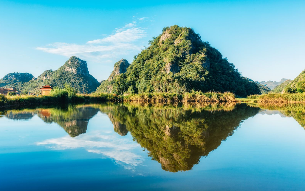 蒲塘秀色位于普者黑景区仙人洞村西南部,四周地势平坦。景区有清澈透明的湖水和远方青翠的山峰,这里空气清新,鸟语花香,非常适合休闲养生,是一家人度假的好去处。
